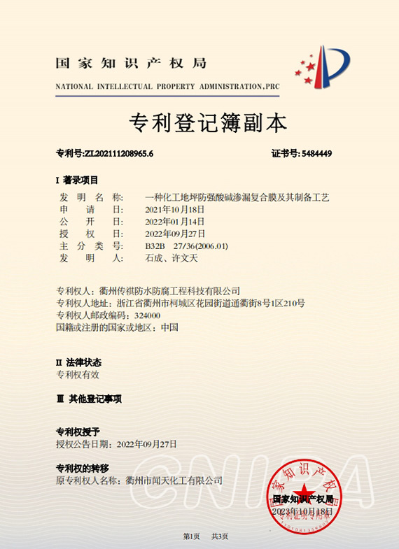衢州傳祺新材料科技有限公司是衢州市聞天化工有限公司的下屬企業;衢州市聞天化工有限公司成立于2003年,是國內最早研發、生產氟碳涂料的企業之一。衢州傳祺新材料科技有限公司成立于2017年,公司專注于高分子氟材料的開發和含氟材料在防腐、防水領域的應用。經過6年的不懈努力,已獲得了化工和建筑領域六項國家發明專利授權和兩項新產品科技成果獎,參與了中國建筑材料流通協會《房屋修繕防水工程規范》標準的編制工作,中建協涂裝委員會浙西工作站設立在我公司。